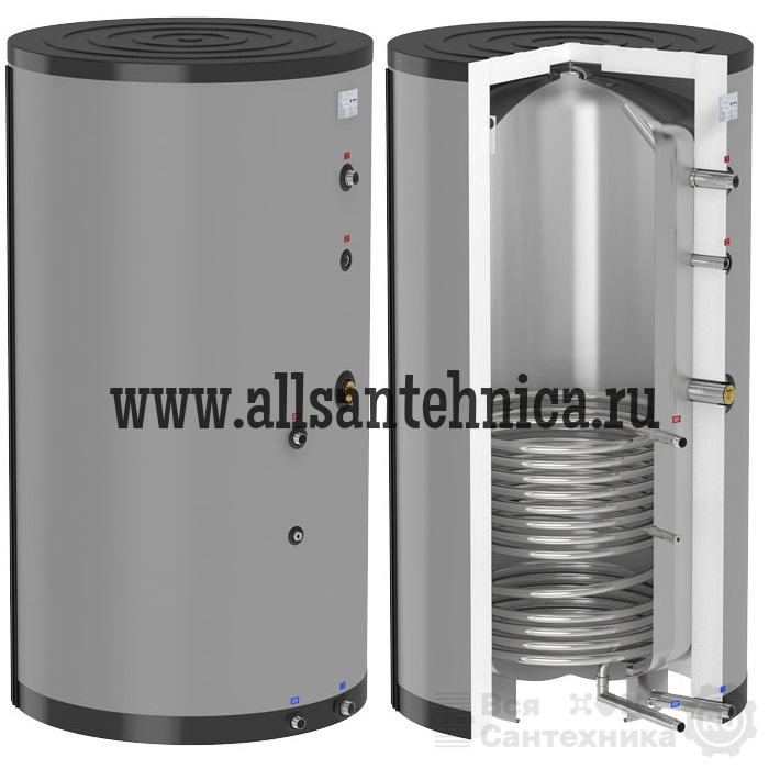 Гладкотрубный теплообменник бака расположен в нижней части накопительного резервуара. Благодаря этому, циркуляция воды создается гравитационным напором, т.е. из-за разницы плотности нагретая «легкая» питьевая вода поднимается к водоразборному штуцеру и затем равномерно распределяется по всему объему резервуара.