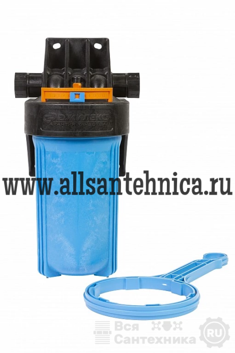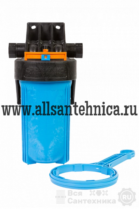 Корпус для картриджного фильтра предназначен для размещения в нём картриджей или фильтрующей засыпки для дальнейшей очистки холодной воды в бытовых условиях. Изготавливается из армлена, прочного материала устойчивого к циклическим нагрузкам и не пропускающего ультрафиолетовые лучи сквозь корпус. Типоразмер колбы - Big Blue 10”. Поворот коллектора на 180° позволяет установить корпус фильтра в магистраль, с направлением движения воды, как слева направо, так и справа налево. Магистральную трубу можно разместить вплотную к стене. Кронштейн является одним целым с крышкой корпуса фильтра. В корпусе предусмотрены специальные технологические отверстия (пробки) для сброса избыточного давления и слива остаточной воды. В комплект поставки входит ключ, с помощью которого можно отвернуть колбу от крышки, а также уплотнительная вставка белого цвета для картриджных элементов без сердечника.