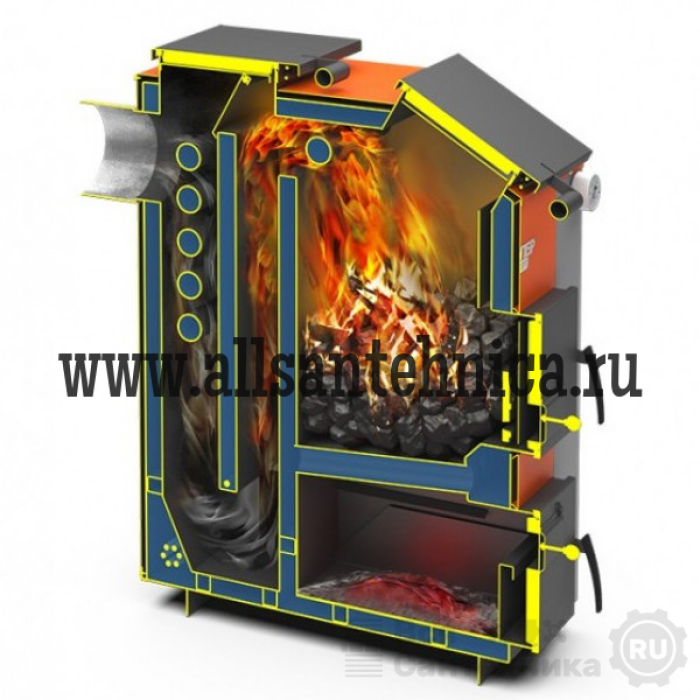 Время горения на одной закладке угля - до 24 часов. Такая длительность достигнута благодаря объему топки, верхнему горению топлива в котле, развитому теплообменнику и трехзонной подаче воздуха.