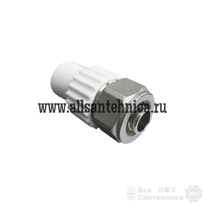 Муфта комбинированная для соединения PPR-PE труб — фитинг предназначен для соединения полипропиленовой трубы либо фитинга, с трубой из полиэтилена (PE-RT и PEX). Монтаж фитинга осуществляется раструбной сваркой (свариваемая поверхность – внутренняя, диаметр – 20 мм), присоединение трубы – обжимное. Металлические элементы фитинга выполнены из латуни, закладная деталь и накидная гайка никелированы.