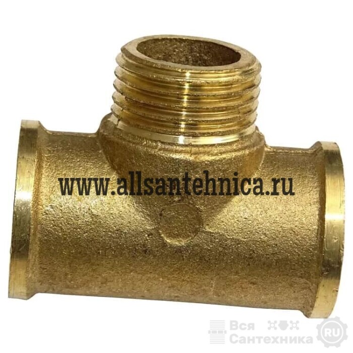 Латунный трехсторонний фитинг, равнопроходной, соединяющий три отрезка трубы, один из которых устанавливается перпендикулярно двум другим. Резьба - внутренняя/наружная/внутренняя цилиндрическая трубная по ГОСТу 6357-81. Фитинги рассчитаны на рабочее давление (PN) 2,5 и 4,0 МПа и температуру транспортируемых сред от -20 до +150 °С.