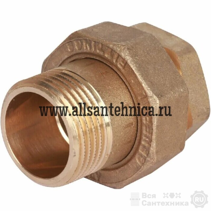 Разъемный сгон, смонтированный из двух частей с помощью накидной гайки (соединение типа «американка»). Резьба – внутренняя/наружная, цилиндрическая трубная по ГОСТу 6357-81. Детали изготовлены методом горячей объемной штамповки из высококачественной латуни марки ЛС 59-1. Уплотнительное кольцо – из синтетического каучука EPDM. Фитинги рассчитаны на рабочее давление (PN) 2,5 и 4,0 МПа и температуру транспортируемых сред от -20 до +150 °С.