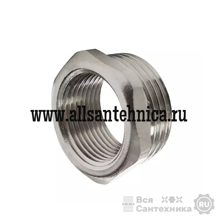 Футорка – это фитинг, обеспечивающий соединение труб разного типоразмера, подключение трубопровода к элементу системы с большим диаметром присоединительного патрубка, ремонт (замену) поврежденной резьбы. Футорка изготовлена методом горячей объемной штамповки из высококачественной латуни марки ЛС 59-1 с гальваническим нанесением никелевого покрытия. Резьба – наружная/внутренняя, по типу – трубная цилиндрическая по ГОСТу 6357-81. Шестигранная головка футорки служит ее вкручиванию гаечным ключом. Фитинги рассчитаны на рабочее давление (PN) 2,5 и 4,0 МПа и температуру транспортируемых сред от -20 до +150 °С.