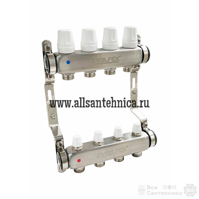 Коллекторный блок объединяет в себе подающий и обратный коллекторы из нержавеющей стали AISI304, ручные балансировочные клапаны, регулирующие клапаны (с возможностью установки электротермического сервопривода), пробки коллекторов и крепежные кронштейны из оцинкованной стали.
