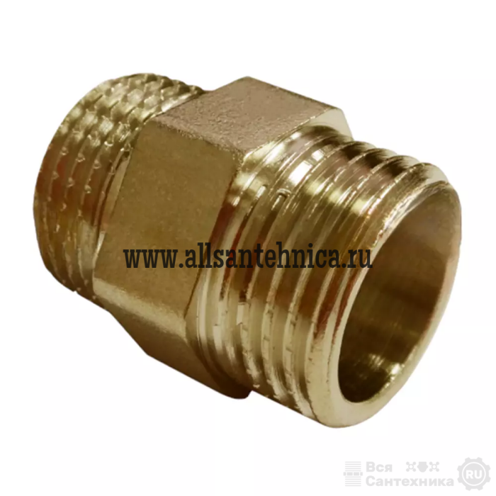 Ниппель (наруж.-наруж.) — латунный фитинг, представляющий собой изделие с наружной резьбой на обоих концах, с помощью которых он соединяется с другими участками трубопровода равного диаметра, резьба цилиндрическая трубная по ГОСТу 6357-81. Предусмотрен участок корпуса шестигранной формы, под гаечный ключ. Фитинги рассчитаны на рабочее давление (PN) 2,5 и 4,0 МПа и температуру транспортируемых сред от -20 до +150 °С.