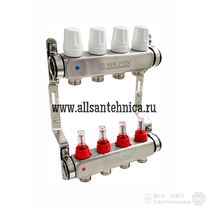 Блок коллекторов объединяет в себе подающий и обратный коллекторы из нержавеющей стали AISI304, ручные настроечные клапаны c расходомерами (ротаметрами), регулирующие клапаны (с возможностью установки электротермического сервопривода), пробки коллекторов и крепежные кронштейны из оцинкованной стали.