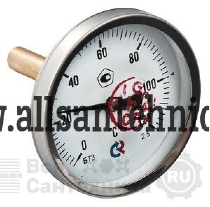 (БT-31) Погружной биметаллический термометр для измерения температуры жидкостей и газов. При оснащении гильзой из нержавеющей стали может использоваться в системах с агрессивной средой. Корпус выполнен из стали. Диаметр корпуса – 63 мм. Класс точности – 2,5. Диапазон измерений – от 0 до 120 или 160 °С. Максимальное рабочее давление (на гильзе) – 2,5 МПа. Подключение – осевое (заднее). Резьба присоединения на гильзе – 1/2".