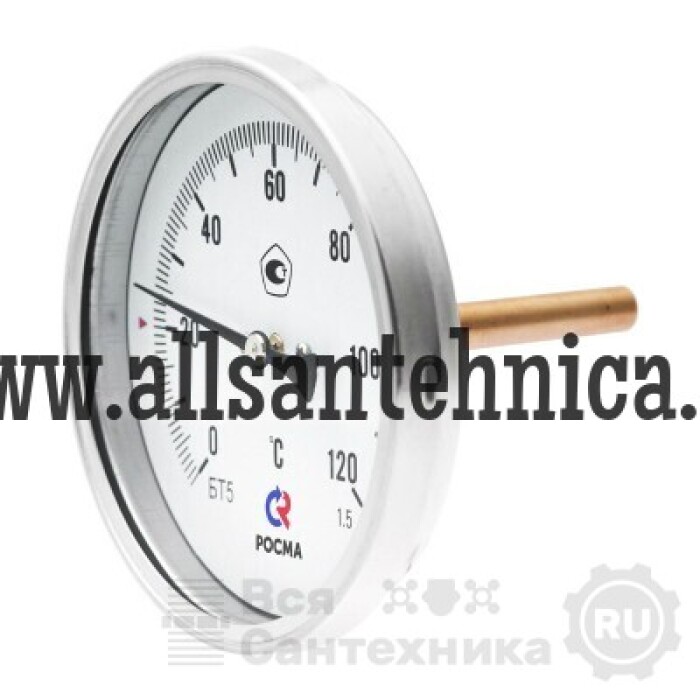 (БТ-51) Погружной биметаллический термометр для измерения температуры жидкостей и газов. При оснащении гильзой из нержавеющей стали может использоваться в системах с агрессивной средой. Корпус выполнен из стали. Диаметр корпуса – 100 мм. Класс точности – 1,5. Диапазон измерений – от 0 до 120 или 160 °С. Максимальное рабочее давление (на гильзе) – 2,5 МПа. Подключение – осевое (заднее). Резьба присоединения на гильзе – 1/2".