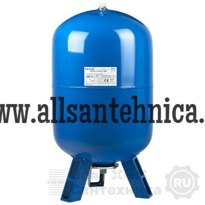 установки предохранительного клапана и воздухоотводчика. Для регулирования давления в газовой полости предусмотрен ниппель. Бак поставляется с азотной газовой подушкой с давлением 1,5 (50, 80 л) или 2,5 (100–500 л) бара. Корпус выполнен из углеродистой стали и покрыт снаружи термостойкой эпоксидной эмалью синего цвета (RAL 5015). Гидроаккумулятор оборудован ножками и устанавливается в вертикальном положении.
