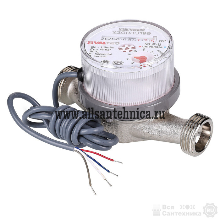 (VLF-15U-IL) Водосчетчик универсальный – для измерения расхода холодной и горячей воды, главным образом – в квартирах. Условный диаметр модели – 1/2"; номинальный расход воды – 1,5 куб. м/ч. Длина прибора – 80 или 110 мм. Резьба присоединительных патрубков – 3/4".