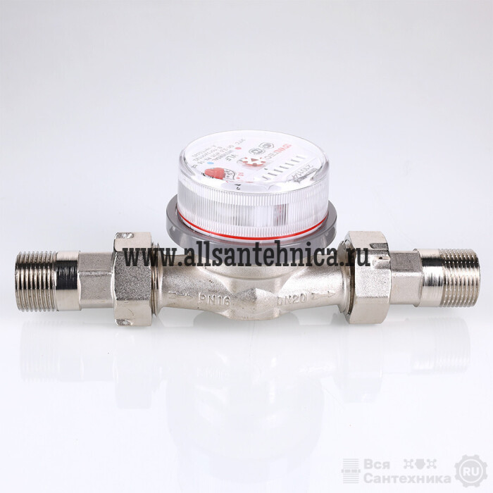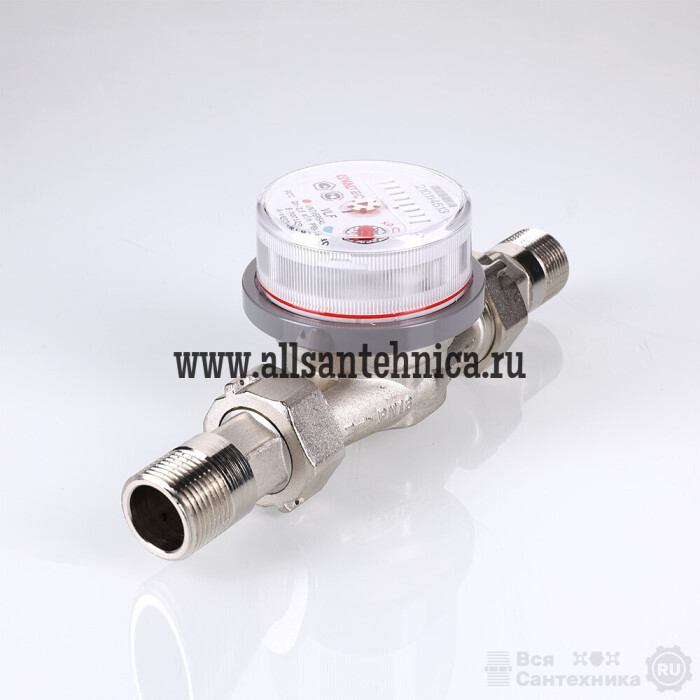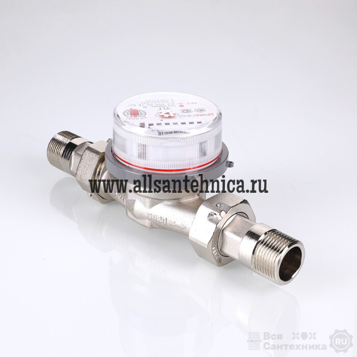 (VLF-20U) Водосчетчик универсальный – для измерения расхода холодной и горячей воды, главным образом – в квартирах. Условный диаметр модели – 3/4"; номинальный расход воды – 2,5 куб. м/ч. Длина прибора без сгонов – 105 мм. Резьба присоединительных патрубков – 1".