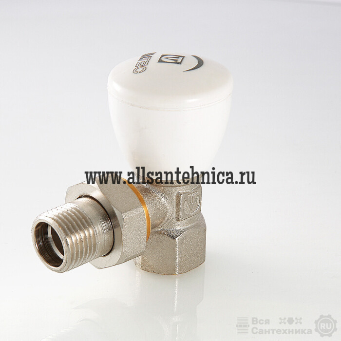 (VT.007.N) Угловой радиаторный клапан. Основное назначение – ручное плавное регулирование расхода теплоносителя через отопительный прибор. При замене регулировочной ручки на защитный колпачок может использоваться в качестве настроечного клапана. Наличие полусгона позволяет монтировать и демонтировать клапан без демонтажа трубопровода. Ремонтопригодный. Рабочая температура – до 110 °С, давление – до 10 бар. Резьба присоединений – внутренняя/наружная.
