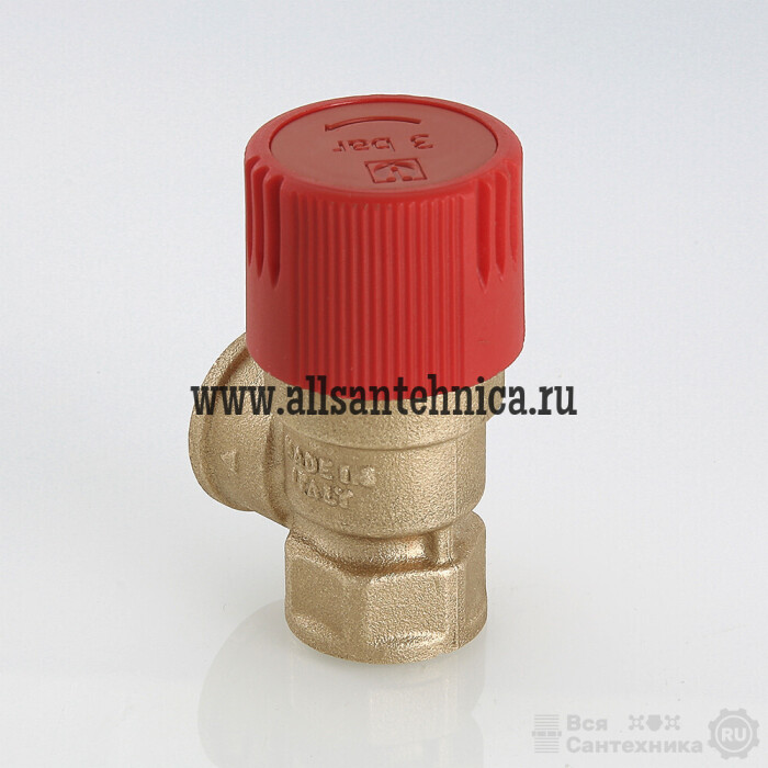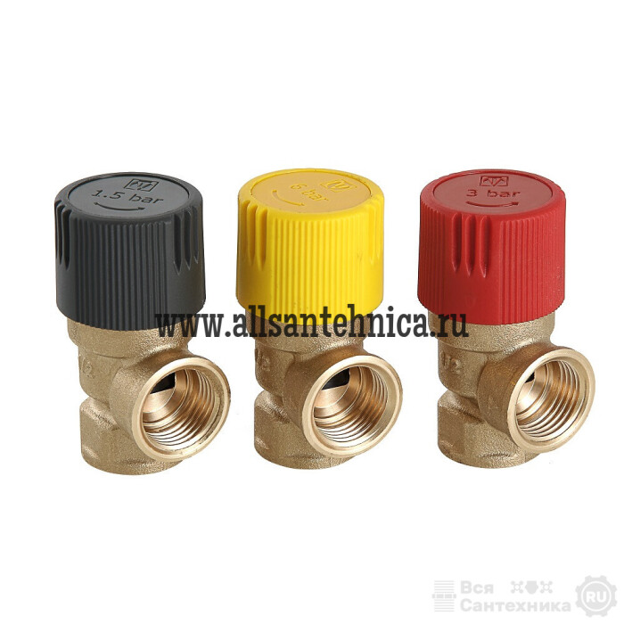 (VT.0490.IG) Клапан предохранительный нерегулируемый, c фиксированной заводской настройкой 1,5/3,0/6 бар (для удобства пользования введена цветовая маркировка: черный колпачок – 1,5 бара, красный – 3, желтый – 6 бар). Обеспечивает защиту от превышения давления водогрейных котлов, бойлеров, сосудов под давлением, систем отопления, напорных трубопроводов сбросом рабочей среды (в качестве рабочей среды может использоваться вода, растворы этиленгликоля или пропиленгликоля и другие жидкости, нейтральные по отношению к материалам клапана) в окружающую среду либо дренажный трубопровод. Максимальная рабочая температура – 115 °С. Предусмотрена возможность ручного открытия клапана предохранительного для проверки работоспособности, профилактики залипания золотниковой обоймы. Резьба присоединения – внутренняя, 1/2".