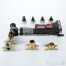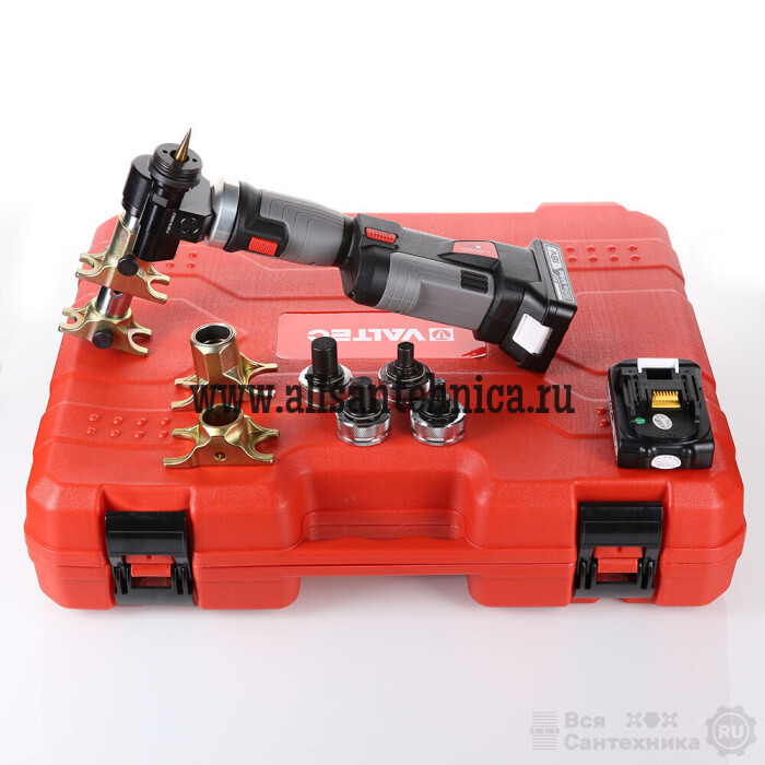 Комплект аккумуляторного инструмента для монтажа аксиальных фитингов включает в себя собственно пресс-инструмент, пресс-зажимы (16/20 и 25/32 мм), расширительные насадки (16, 20, 25, 32 мм), две литий-ионных аккумуляторных батареи (АКБ) общей емкостью 2 А·ч, зарядное устройство для АКБ (напряжение питания – 220 В, 50 Гц), шнур для зарядного устройства, резак для труб 16–32 мм. Оборудование помещено в кейс красного цвета.