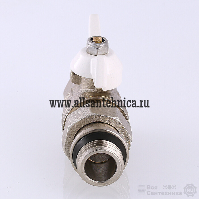 (VT.227.NRW) Прямой полнопроходной ремонтопригодный шаровой кран с увеличенным ресурсом. Соединен накидной гайкой с резьбовым полусгоном. Корпуса деталей – латунные, никелированные. Кран оснащен ручкой типа «бабочка» с утолщенной стенкой из алюминиевого сплава и эпоксидной покраской белого цвета. Полусгон укомплектован уплотнительным кольцом из эластомера EPDM. Резьба присоединений – внутренняя/наружная.