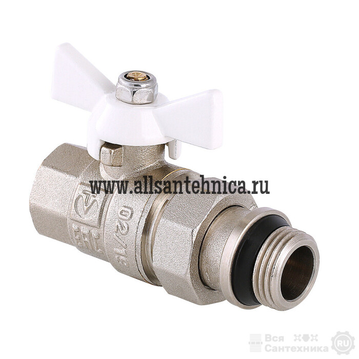 (VT.227.NRW) Прямой полнопроходной ремонтопригодный шаровой кран с увеличенным ресурсом. Соединен накидной гайкой с резьбовым полусгоном. Корпуса деталей – латунные, никелированные. Кран оснащен ручкой типа «бабочка» с утолщенной стенкой из алюминиевого сплава и эпоксидной покраской белого цвета. Полусгон укомплектован уплотнительным кольцом из эластомера EPDM. Резьба присоединений – внутренняя/наружная.