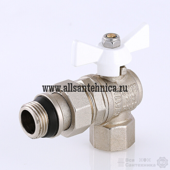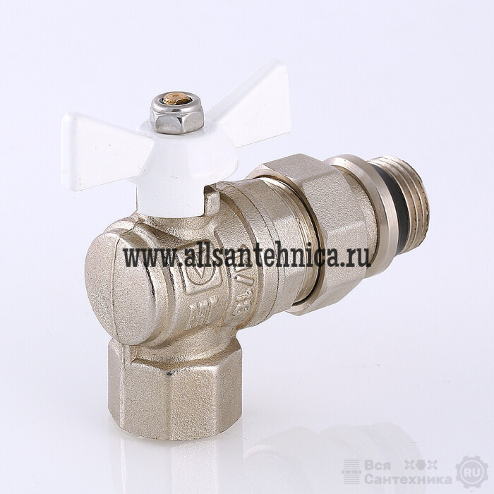 (VT.228.NRW) Угловой полнопроходной ремонтопригодный шаровой кран с увеличенным ресурсом. Соединен накидной гайкой с резьбовым полусгоном. Корпуса деталей – латунные, никелированные. Кран оснащен ручкой типа «бабочка» с утолщенной стенкой из алюминиевого сплава и эпоксидным покрытием белого цвета. Полусгон укомплектован уплотнительным кольцом из эластомера EPDM. Резьба присоединений – внутренняя/наружная.