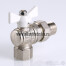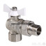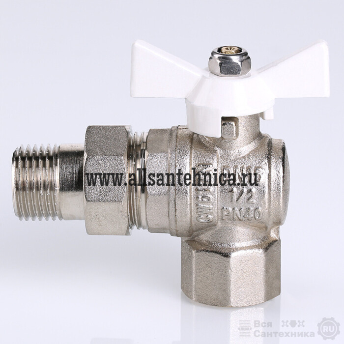 (VT.228.NW) Угловой полнопроходной ремонтопригодный шаровой кран с увеличенным ресурсом. Соединен накидной гайкой с резьбовым полусгоном. Корпуса деталей – латунные, никелированные. Кран оснащен ручкой типа «бабочка» с утолщенной стенкой из алюминиевого сплава и эпоксидным покрытием белого цвета. Резьба присоединений – внутренняя/наружная.