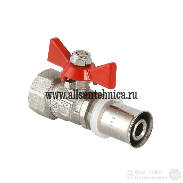 (VT.242.N) Шаровой кран редуцированный (уменьшенного прохода) для использования в составе инженерных систем и технологических установок на основе металлополимерных труб при температуре от –15 до +110 °С и рабочем давлении до 10 бар. Неремонтопригодный, с минимальным ресурсом в 4 тыс. циклов. Оснащен ручкой типа «бабочка» из алюминиевого сплава с эпоксидной покраской. Пресс-соединение с металлополимерным трубопроводом – одностороннее; резьбовой патрубок с внутренней резьбой. Не предназначен к применению на стояках, магистральных трубопроводах и участках систем, в которых могут возникнуть изгибающие усилия, передаваемые на корпус крана.