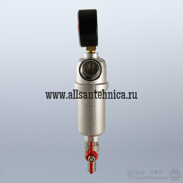 Корпус и колба фильтра выполнены из латуни марки CW617N (европейский стандарт EN 12165), никелированы. Предусмотрены дренажный шаровой кран со штуцером для подключения шланга и манометр для контроля уровня загрязненности сеток. Фильтр монтируется в вертикальном положении, колбой вниз. Резьба присоединений – внутренняя.