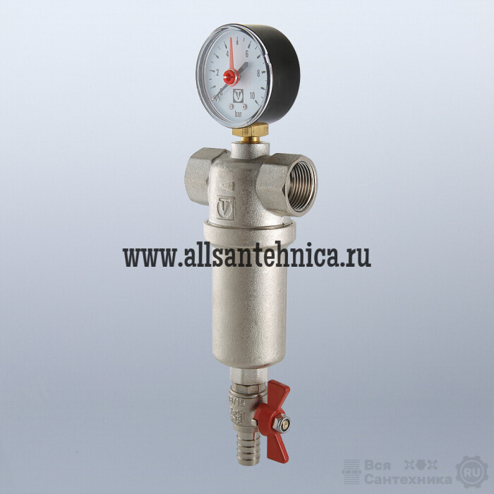 Корпус и колба фильтра выполнены из латуни марки CW617N (европейский стандарт EN 12165), никелированы. Предусмотрены дренажный шаровой кран со штуцером для подключения шланга и манометр для контроля уровня загрязненности сеток. Фильтр монтируется в вертикальном положении, колбой вниз. Резьба присоединений – внутренняя.
