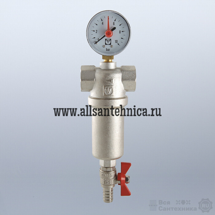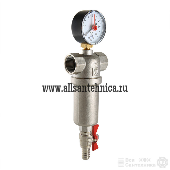 Корпус и колба фильтра выполнены из латуни марки CW617N (европейский стандарт EN 12165), никелированы. Предусмотрены дренажный шаровой кран со штуцером для подключения шланга и манометр для контроля уровня загрязненности сеток. Фильтр монтируется в вертикальном положении, колбой вниз. Резьба присоединений – внутренняя.