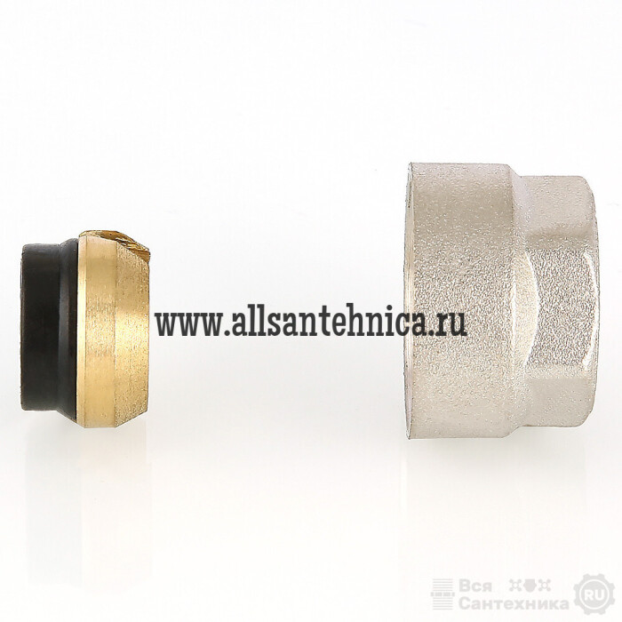 (VT.4430.NVE) Латунный фитинг с накидной гайкой, обжимным кольцом и резиновым уплотнением для подключения медной трубы диаметром 15 мм к выходу коллектора или патрубку иной арматуры диаметром 3/4", стандарт соединения – «евроконус».