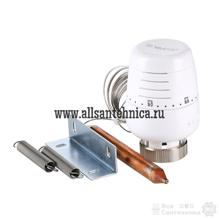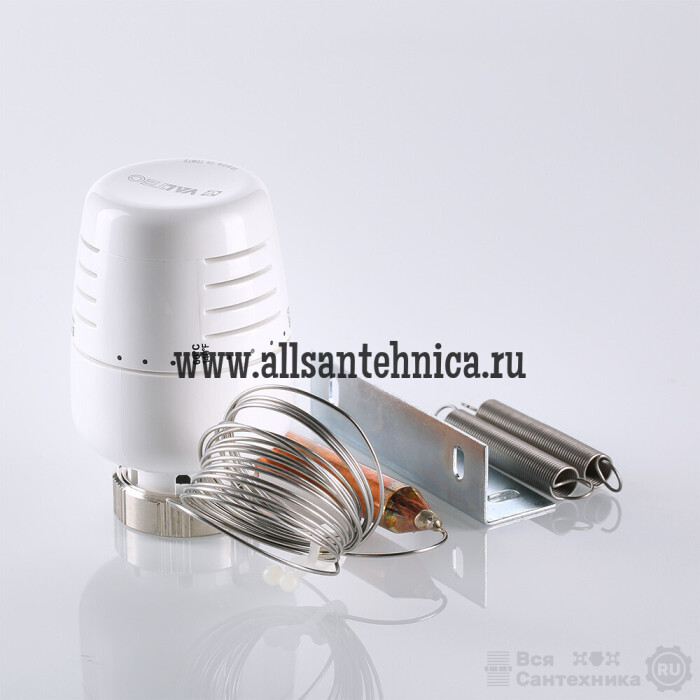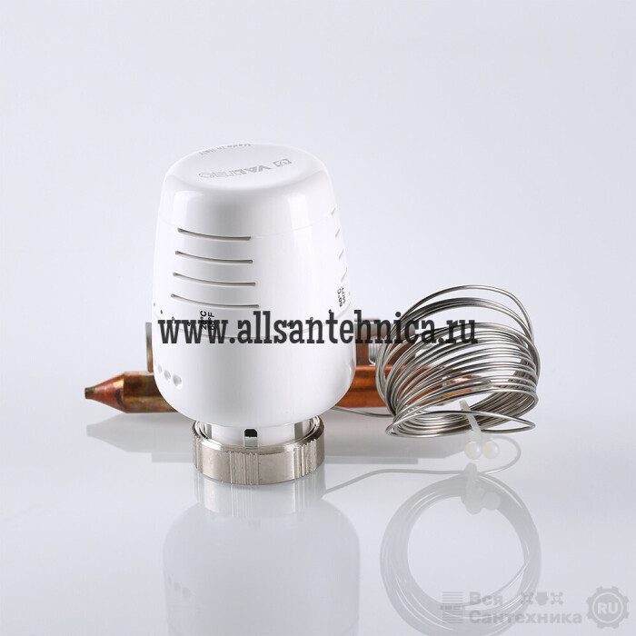 (VT.5012.0) Термостатическая головка, соединенная медной капиллярной трубкой длиной 2 м с выносным накладным датчиком температуры. Диапазон регулирования – от 20 до 60 °C. Головка применяется для управления термостатическим клапаном в составе насосно-смесительных узлов напольного отопления (теплый пол). Датчик монтируется на трубопроводе с помощью ложемента и хомутов.
