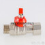 (VT.806.N) Латунный никелированный кран для подключения манометра. Присоединение измерительного прибора осуществляется с помощью накидной гайки с уплотнением в виде паронитовой прокладки. Седельные кольца шарового крана выполнены из тефлона, уплотнение штока изготовлено из EPDM. Вращение ручки крана позволяет произвести подключение манометра к измеряемой среде, его отключение, сброс воздуха из манометра, сброс воздуха из измеряемой среды. Предусмотрен резьбовой штуцер для присоединения контрольного (поверочного) манометра. Кран предназначен для систем с рабочим давлением до 16 бар и максимальной температурой 130 °С. Резьба подключения крана – наружная, манометра – внутренняя.