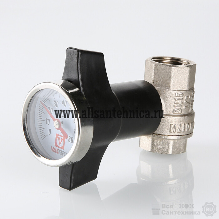 (VT.808.N) Термометр, встроенный в рукоятку управления шарового крана VALTEC BASE VT.808, обеспечивает визуальный контроль температуры рабочей среды в тепловых пунктах, узлах ввода горячей воды, трубопроводах обвязки бойлера и других точках инженерных систем. Термометр соединен с шаровым затвором гильзой из медного сплава, что позволяет измерять температуру с минимальной погрешностью. При необходимости прибор легко извлекается из рукоятки, а его гнездо закрывается заглушкой из ABS-пластика. Из этого же материала выполнена и сама рукоятка крана. Диаметр шкалы термометра – 42 мм, диапазон измерений – 0–80 °С. Резьба присоединения шарового крана с термометром VT.808 – внутренняя.