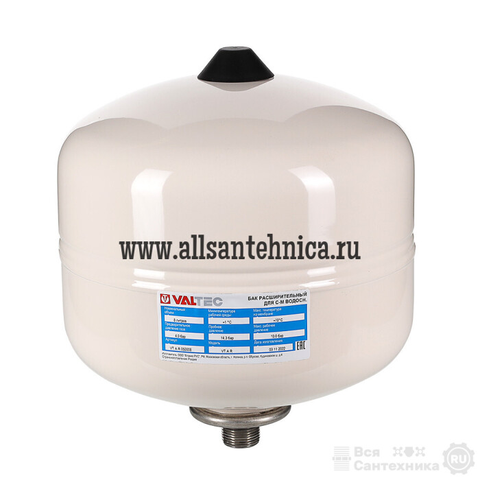 (VT.A.R) Мембранные баки VALTEC VT.A.R предназначены для поддержания требуемого рабочего давления, сглаживания колебаний давления, компенсации теплового расширения, гидравлических ударов и накопления запаса воды в системах холодного (в том числе питьевого) и горячего водоснабжения с температурой воды не более +70 ºС. Максимальное рабочее давление в системе – 10 бар.