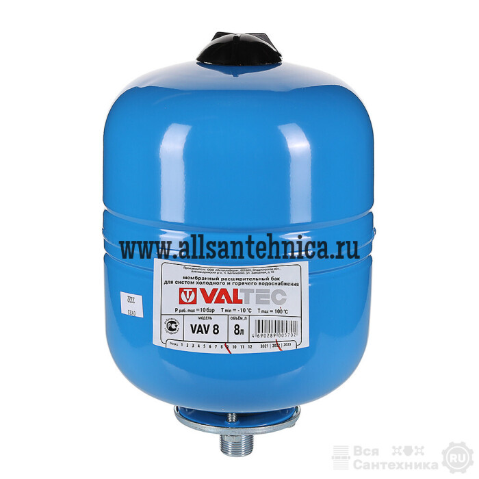 (VT.AV.B) Мембранные баки VALTEC VT.AV.B предназначены для систем холодного водоснабжения, в том числе – питьевого, с рабочим давлением до 10 бар. Допускается также их использование в системах горячего водоснабжения и отопления с температурой теплоносителя не более 100 °С. Заводское давление в газовой камере (преднастройка) – 1,5 бара.