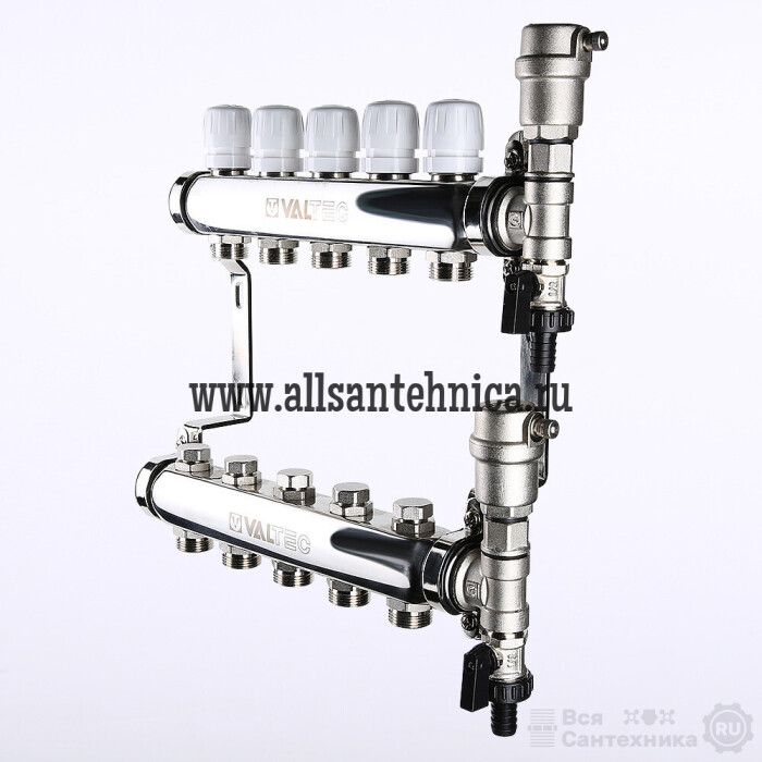 (VTc.588.EMNX) Коллекторный блок из нержавеющей стали служит для распределения потоков по контурам теплого пола, радиаторного отопления, прочих климатических систем, где в качестве теплоносителя используется вода либо незамерзающие растворы гликоля с максимальной рабочей температурой 90 °С, рабочим давлением до 9 бар.