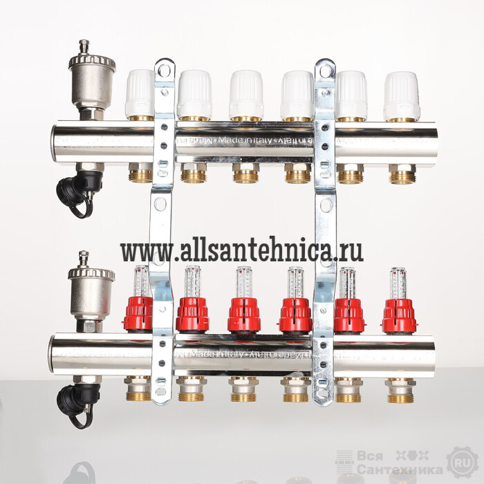 На выходах прямого коллектора установлены настроечные клапаны с расходомерами, обратный коллектор оснащен регулировочными клапанами (ручные, с возможностью оборудования сервоприводами).