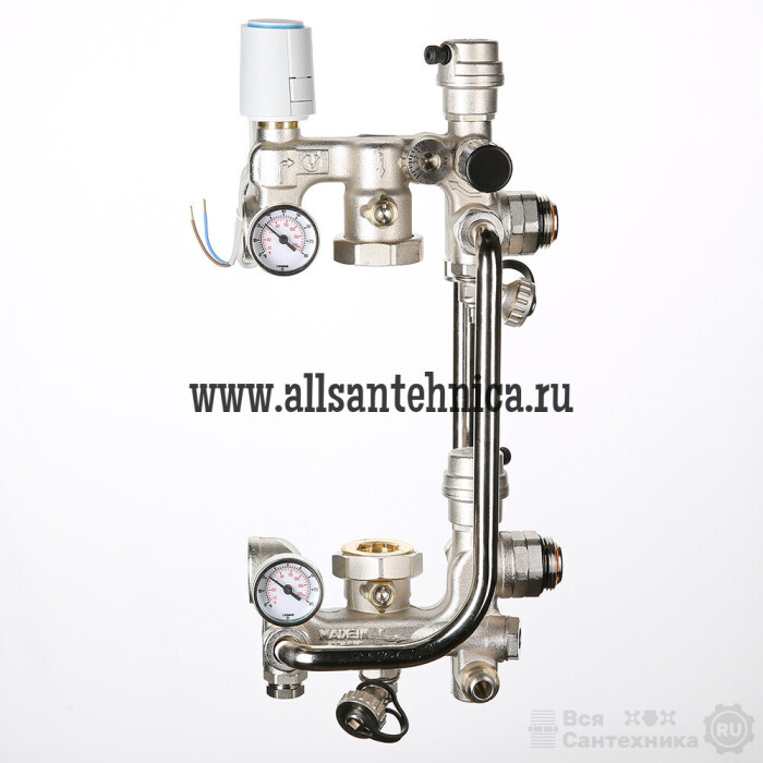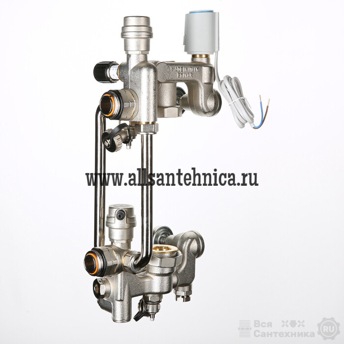 (VT.COMBI.S) В насосно-смесительном узле для водяного теплого пола VALTEC COMBI.S.180.M приготовление теплоносителя с температурой, пониженной относительно температуры прямой линии первичного контура, происходит за счет подмеса жидкости из обратной линии вторичного контура. Регулирование осуществляется двухходовым клапаном, установленным на подающей линии первичного контура и оснащенным электротермическим сервоприводом VT.TE3041.0.024 (нормально закрытый).