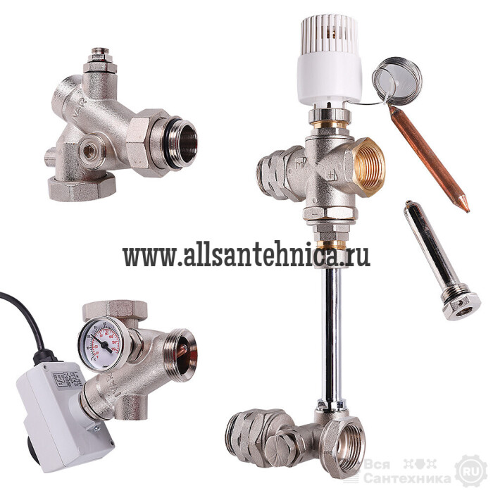 (VT.DUAL.0) Узел VALTEC DUALMIX состоит двух модулей – насосного и термостатического, между которыми монтируется коллекторный блок вторичного контура. Для смешения горячего теплоносителя с «обраткой» используется трехходовой клапан, управляемый термостатической головкой с выносным погружным датчиком. (При использовании контроллера отопления функция управления смесительным клапаном передается ему.) Другие основные элементы узла: перепускной байпас; балансировочный клапан; встроенные шаровые краны для отключения циркуляционного насоса; ручной воздухоотводчик; погружной термометр. Узел рассчитан на применение в системах отопления c водяным теплым полом при рабочем давлении до 10 бар и температуре теплоносителя в первичном контуре до 120 °С. Монтажная длина насоса (он приобретается отдельно) – 130 мм.