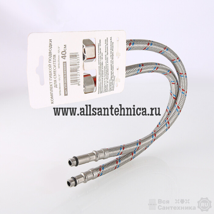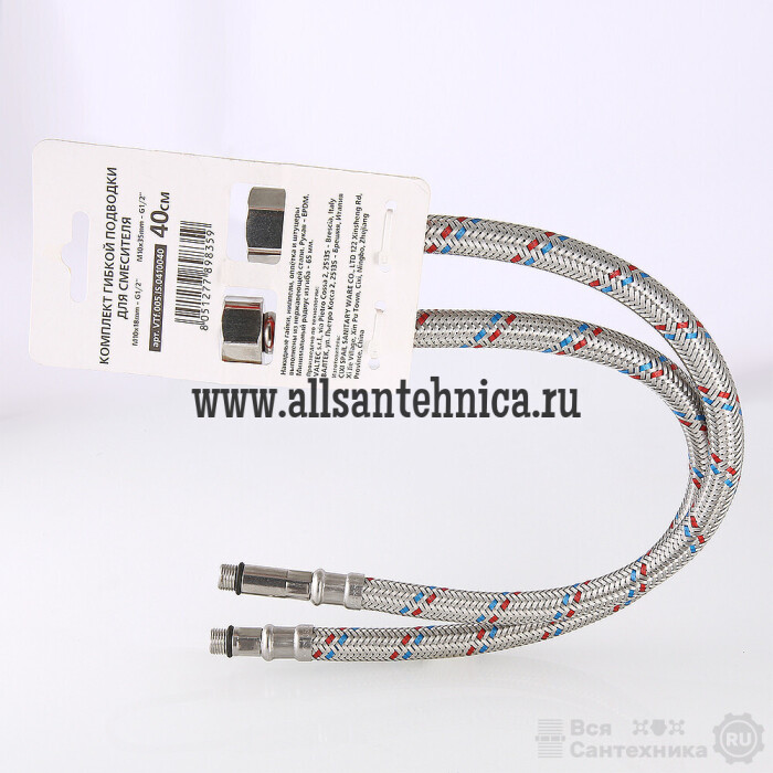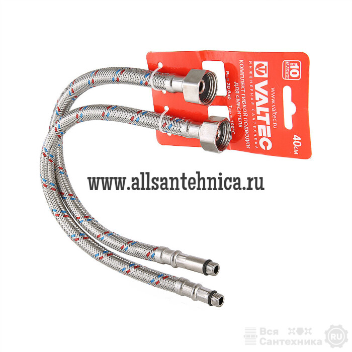 (VTf.005.IS) Комплект гибкой подводки для подключения смесителя объединяет в себе пару подводок гибких VALTEC c концевыми элементами гайка–штуцер, 1/2” х M10, длина штуцера – 18 и 35 мм (такое сочетание обеспечивает удобное подсоединение подводки).