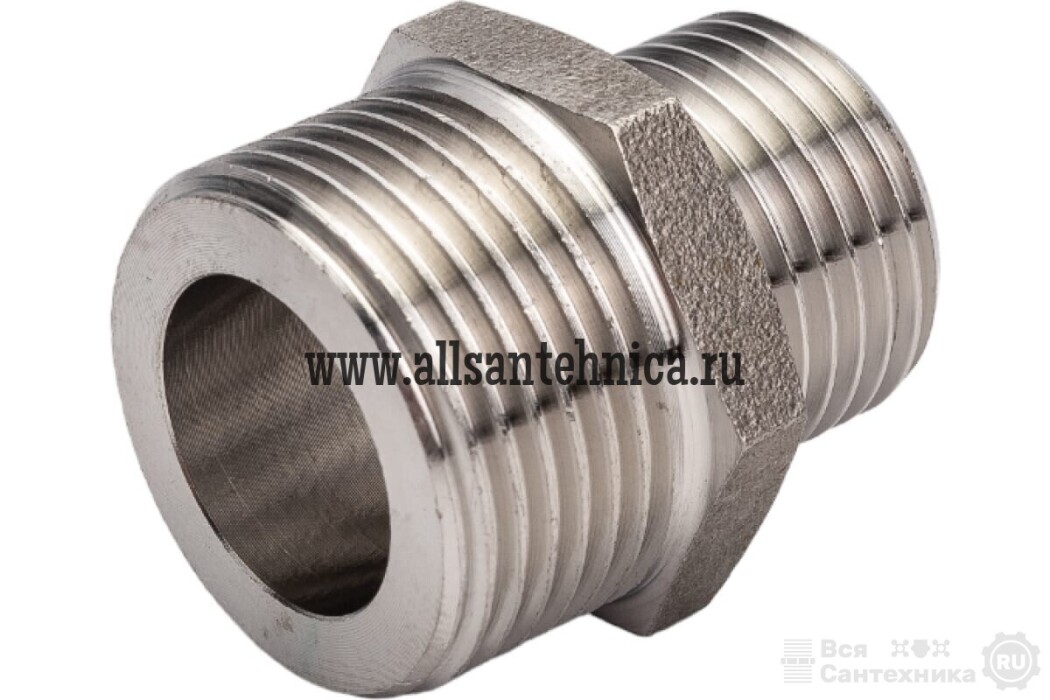 (VTi.580.I) Ниппель переходной из нержавеющей стали в составе системы VT.INOX-PRESS предназначен для соединения элементов с внутренней резьбой разных диаметров. Резьба патрубка меньшего диаметра имеет насечки – для эффективного удержания уплотняющего материала. Шестигранный – под гаечный ключ – участок корпуса облегчает монтаж соединения. Материалом фитинга служит сталь марки AISI 304, устойчивая к коррозии, химическому и термическому воздействию. В то же время область рекомендуемого применения фитингов VT.INOX-PRESS исключает трубопроводы жидких углеводородов и хлороводородных растворов.