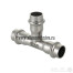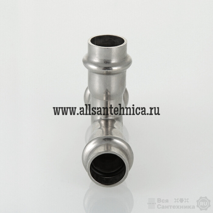(VTi.931.I) Трехраструбный пресс-тройник из нержавеющей стали обеспечивает соединение трех тонкостенных стальных труб систем водоснабжения, отопления, иных инженерных и технологических установок с рабочей температурой до 120 °С и давлением до 16 бар. Изделие изготовлено из стали AISI 304. Материал уплотнительных колец – эластомер EPDM. Отдельно можно приобрести уплотнительные кольца из FPM (витон); в этом случае максимальная рабочая температура увеличивается до 140 °С.