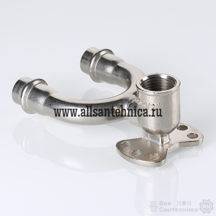 (VTi.954.DI) Проходная водорозетка в системе INOX-PRESS представляет собой U-образный тройник с угловым переходом на внутреннюю резьбу в центральном отводе и креплением.