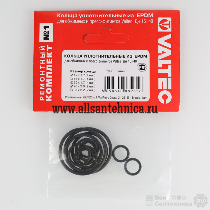(VT.KIT.1) Набор уплотнительных колец для обжимных и пресс-фитингов VALTEC, рассчитанных на присоединение труб c наружным диаметром 16–40 мм. Кольца выполнены из EPDM. Содержимое набора пригодится в случае потери или повреждении штатных уплотнительных колец, а также при повторном монтаже обжимных фитингов.