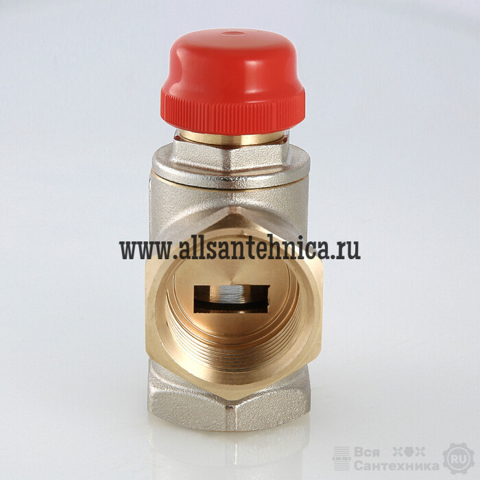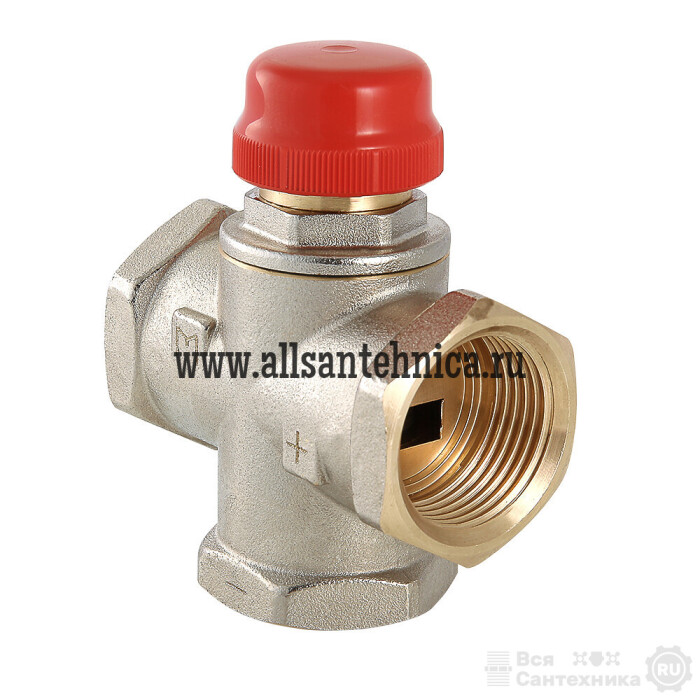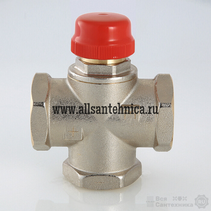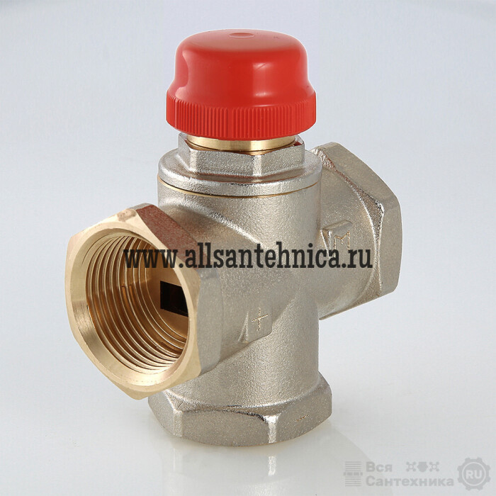 (VT.MR01.N) Клапан предназначен для использования в смесительных узлах гидравлических систем (байпасные узлы подмеса, узлы смешения для получения заданного уровня температуры смешанной жидкости и т.п.). Регулирование клапаном может осуществляться вручную или с помощью сервопривода. Корпус выполнен из латуни марки CW617N (европейский стандарт EN 12165), никелирован. Материал штока, основания золотника и пружины – нержавеющая сталь марки AISI 316, золотникового уплотнителя – EPDM. Резьба присоединительных патрубков – внутренняя, 1". Данная модель – повышенной пропускной способности, с боковым смешением, для установки в байпас без возможности его полного перекрытия (такая схема позволяет обойтись без перепускного клапана). Клапан не обеспечивает полного перекрытия потока.