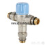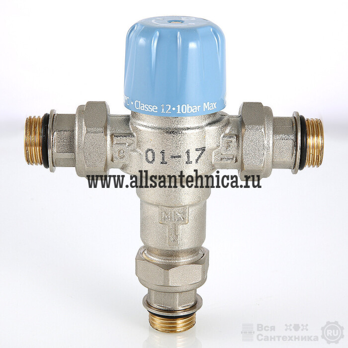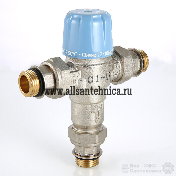 (VT.MT10RU) Трехходовой термостатический смесительный клапан с изменяемой в диапазоне от 30 до 50 °C настройкой. Предназначен для автоматического поддержания заданной температуры в системе горячего водоснабжения. Ее превышение исключается даже при полном отключении холодной воды, что позволяет использовать смеситель в школах, детских садах, других общественных зданиях. Термостат оперативно реагирует на изменение температуры и давления входящих потоков. Клапан выполнен из качественной латуни, никелирован. Встроенный термочувствительный элемент – жидкостного типа (наполнен толуолом). Патрубки клапана соединены накидными гайками с полусгонами. Резьба присоединений – внешняя. Входы смесителя комплектуются обратными клапанами из нейлона. Максимальная температура на входе горячей воды – 90 °C, допустимое рабочее давление входных потоков – до 10 бар.