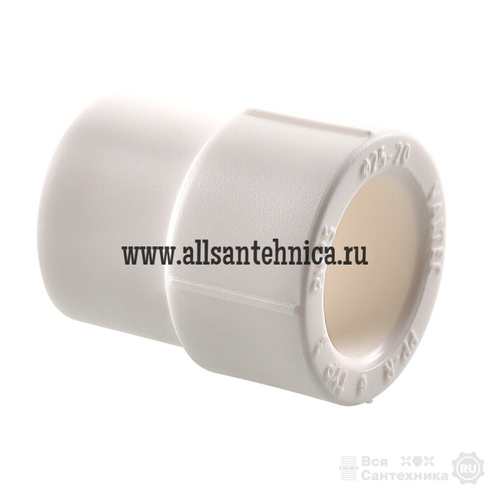 (VTp.704.0) Фитинг для соединения деталей полипропиленового трубопровода методом раструбной сварки с переходом на другой диаметр. Предназначен для случаев, когда переход с одного диаметра трубопровода на другой осуществляется через фитинг, например, полипропиленовый угольник или тройник. Свариваемые поверхности – внутренняя/наружная.