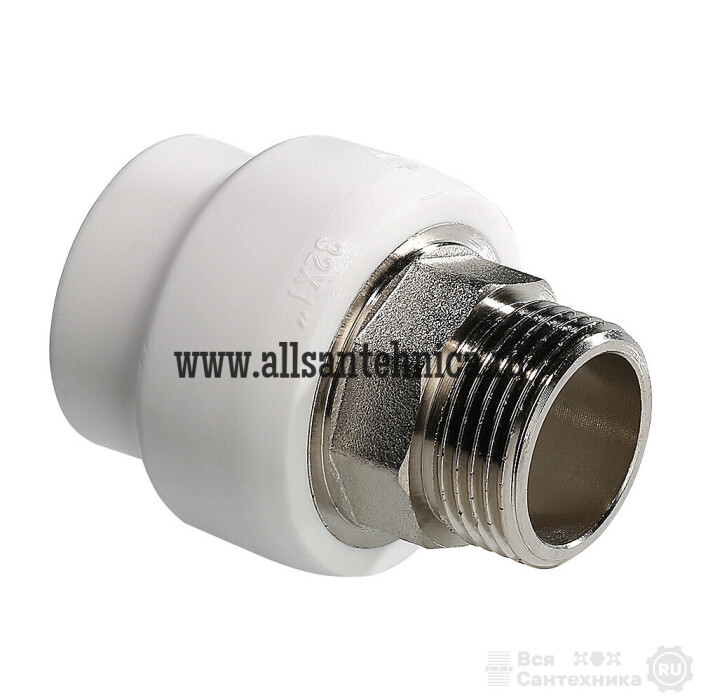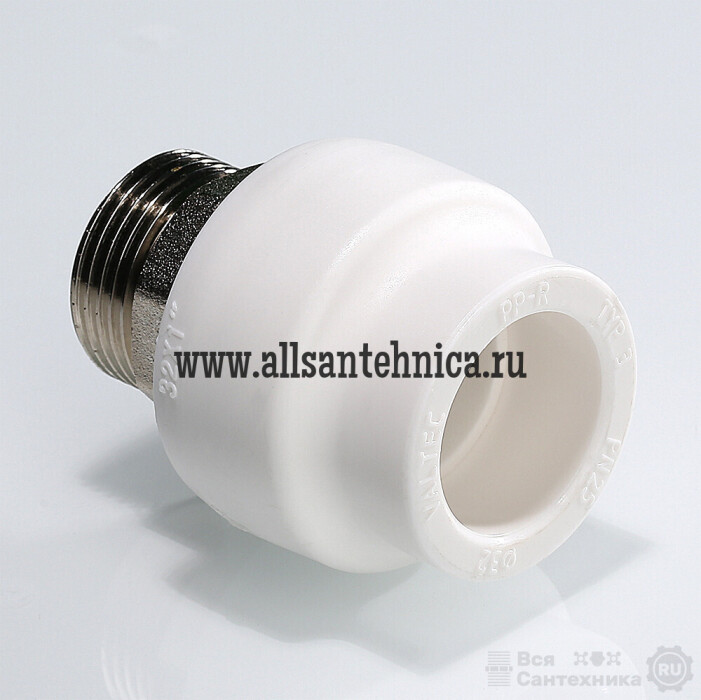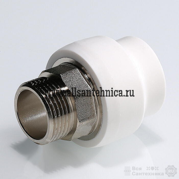 (VTp.707.0) Прямой полипропиленовый фитинг для соединения полипропиленовой трубы и компонента инженерной системы с резьбовым подключением. Резьба фитинга – наружная трубная по ГОСТу 6357. Предусмотрен участок закладной детали под гаечный ключ.