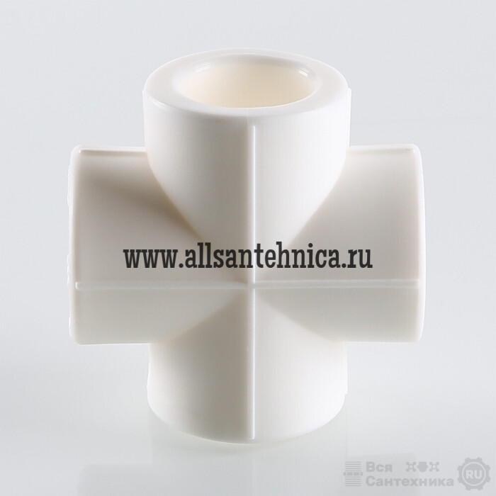(VTp.741.0) Фитинг для соединения четырех полипропиленовых труб равного диаметра (крестовина). Монтаж производится методом раструбной сварки.