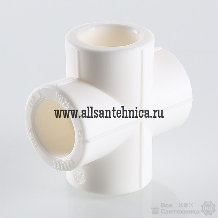 (VTp.741.0) Фитинг для соединения четырех полипропиленовых труб равного диаметра (крестовина). Монтаж производится методом раструбной сварки.