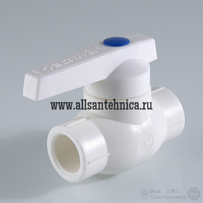 (VTp.743.0) Шаровой кран из полипропилена предназначен для использования в качестве запорной арматуры в составе систем водоснабжения из полипропиленовых труб. Кран имеет латунный хромированный шаровой затвор и латунную сальниковую гильзу. Монтаж осуществляется методом раструбной сварки. Может использоваться на трубопроводах холодной и горячей воды.