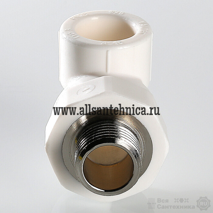 (VTp.753.0) Двухсторонний комбинированный фитинг (полипропиленовый фитинг) для соединения под углом 90° друг к другу полипропиленового трубопровода и компонента инженерной системы с резьбовым подключением. Резьба фитинга – наружная трубная по ГОСТу 6357. Предусмотрен участок корпуса шестигранной формы, под гаечный трубный рычажный ключ.