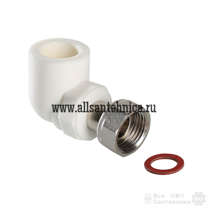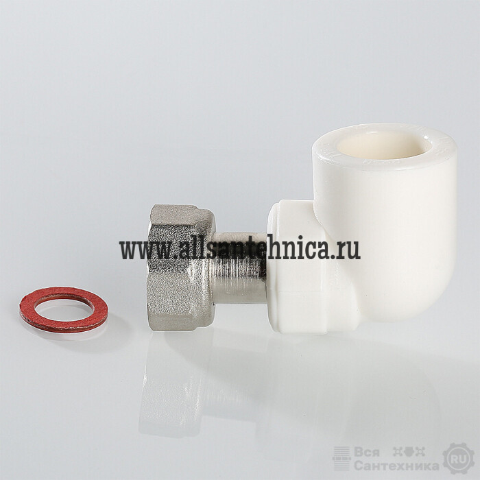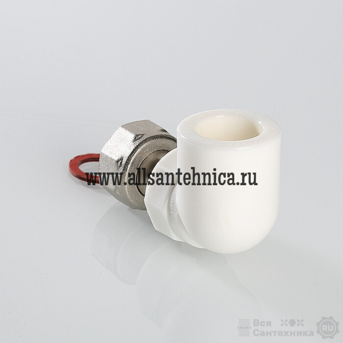 (VTp.758.0) Двухсторонний полипропиленовый фитинг для соединения под углом 90° друг к другу полипропиленового трубопровода и компонента инженерной системы с резьбовым подключением. Монтаж осуществляется с помощью накидной гайки. Резьба – внутренняя трубная по ГОСТу 6357.